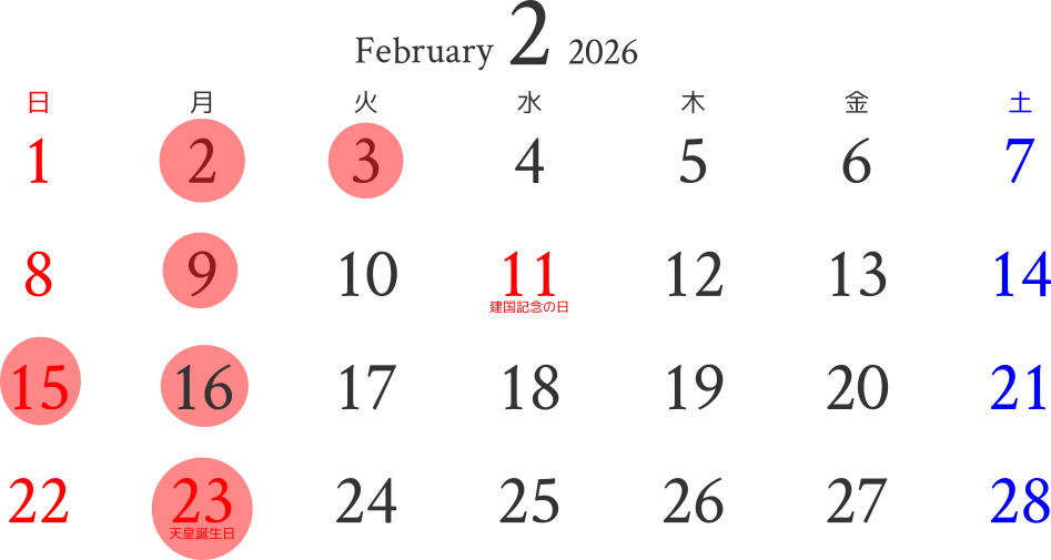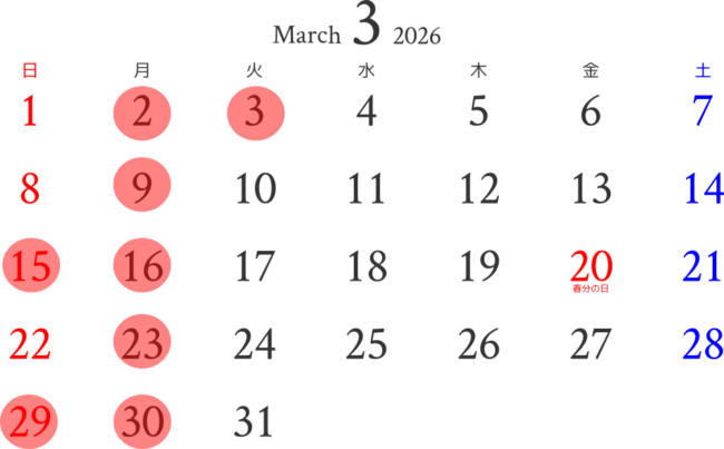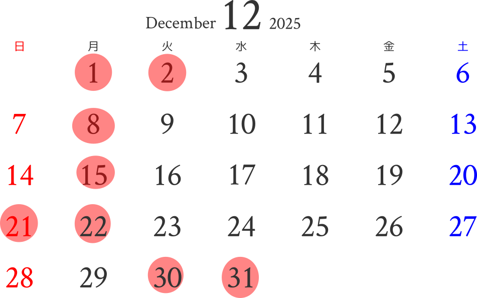 毎週月曜、第1火曜、第3日曜、31日が定休日となっております。
