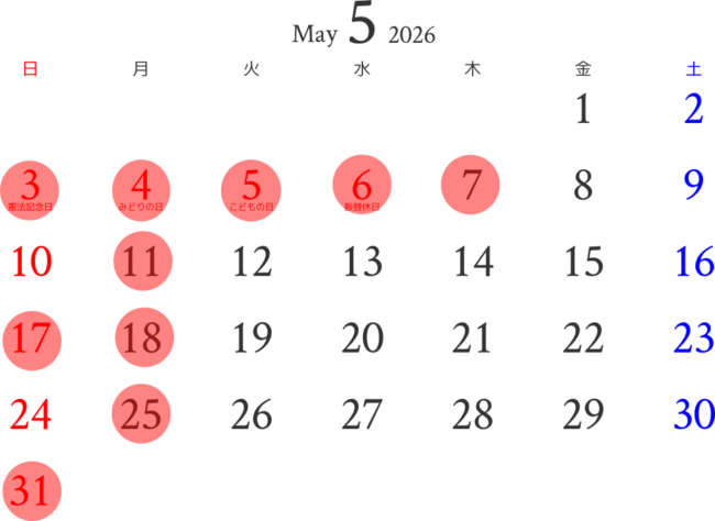 5月の営業日と定休日です。